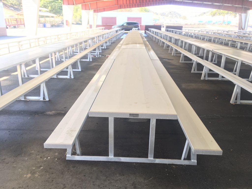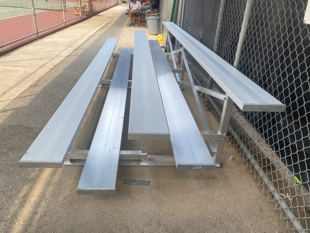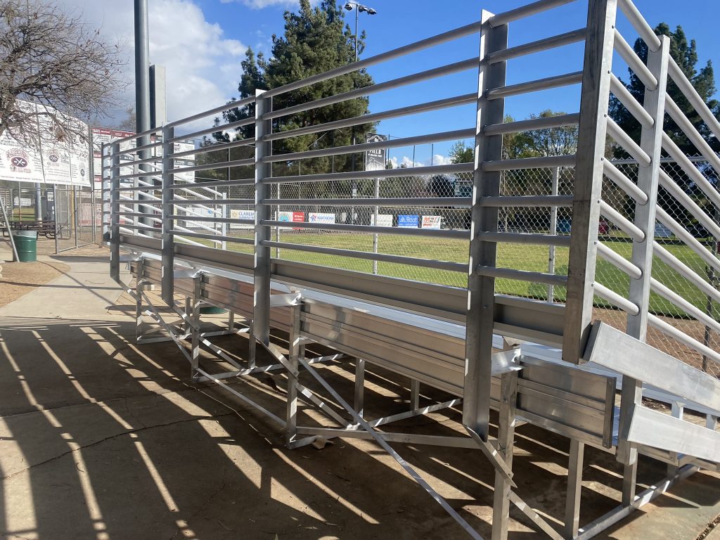 Our bleachers come standard with horizontal aluminum railing (Also available in vertical), not cheaper steel chain link fence. Not to mention more visually attractive.
